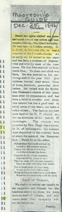 Other Age 74. Funeral at MP Church. Buried Mooresville Cemetery. "Fell from a load of fodder on Monday, and died on Tuesday. Would have been 74 years old on Thursday of this week." [Dates given above are those on tombstone.] Born a Quaker. Moved to Mooresville early in life. "Died of Injuries -- Monday, Omri Schooley and Charles Daniel were descending Bray Hill, just East (West) of Mooresville, when the load shifted, and Omri Schooley was seriously injured and later died." -- Martinsville Republican, Dec. 17, 1896 "Born in Clinton County, Ohio and moved to the Mooresville area. He married 1st to Elizabeth Cox and they had 1 child. In 1848, he married his surviving wife, and they had 10 children, with 7 surviving." -- Mooresville Guide, Dec. 25, 1896