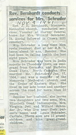 | Other | Age 78. Harvey Funeral Home (Rev. J. E. Bernhardt.) Buried Crown Hill cemetery, Indianapolis. Parents: Theodore and Barbara Denk Dietz (he was born in Germany.) |