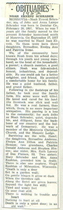 | Survived By | Wife; daughters, Bernadine Ambrose, Evelyn Ann Dillon, and Patricia Henson; nephew, Virgil Rushton; 2 grandsons; sister, Mrs. Ruth Lavery of Des Plaines, Illinois. (2 sisters are deceased, Mary Schrader and Mrs. Anna Rushton.) |