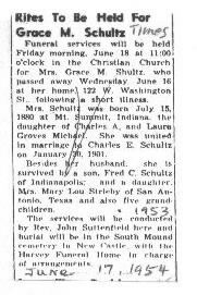 Survived By Husband; son, Frank C. Schultz of Indianapolis; daughter, Mary Lou Strieby of San Antonio, Texas; 5 grandchildren.