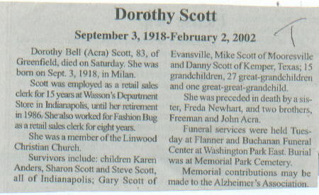 Survived By Children, Karen Anders, Sharon Scott, Steve Scott, Gary Scott, Mike Scott, and Danny Scott; 15 grandchildren; 27 great-grandchildren; one great-great-grandchild.