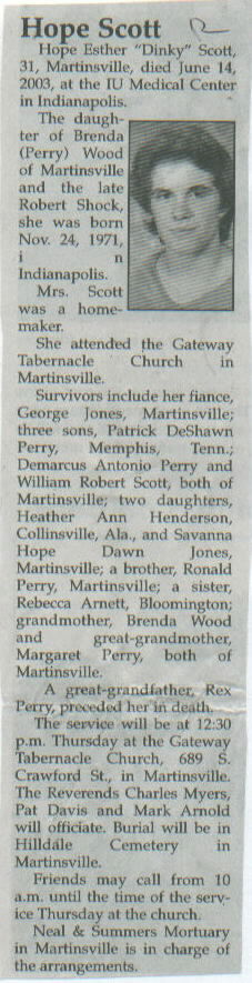 | Survived By | Mother, Brenda (Perry) Wood; fiance, George Jones; 3 sons, Patrick DeShawn Perry, Demarcus Antonio Perry, and William Robert Scott; 2 daughters, Heather Ann Henderson and Savanna Hope Dawn Jones; brother, Ronald Perry; sister, Rebecca Arnett; grandmother, Brenda Wood; great-grandmother, Margaret Perry. |