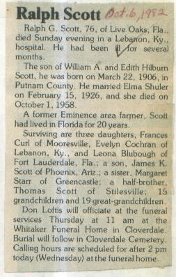 | Other | Age 76. Whitaker Funeral Home, Cloverdale. Buried Cloverdale cemetery. Former Eminence farmer. Lived in Florida 20 years. Parents: William A. and Edith Hilburn Scott. |