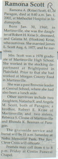 Survived By Spouse; mother, Galatia M. (Hoskins) Krise; 2 daughters, Natasha R. and Angela M. Scott; brother, Robert E. Krise; 2 sisters, Rebecca S. Clouse and Rhonda K. Beaman.