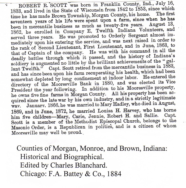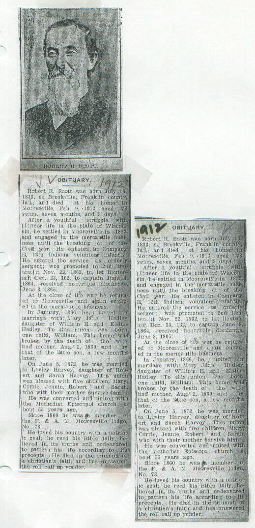 | Other | Age 78. Born in Franklin Co., Ind. Civil War veteran: enlisted in Co. E, Twelfth Indiana Volunteers. Vice President of the Mooresville Bank. Married Mary J. Hadley on Jan. 10, 1866; she died in 1869. On June 5, 1872, he married Louisa H. Harvey; they had five children together: Mary, Carie, Jennie, Robert H., and Sallie. He was a pioneer merchant in Mooresville; had a grocery store: "General dealer in choice family groceries, provisions, fine teas & tobaccos, hardware, wooden, willow, glass & queensware. Established business in 1868, previous to which he was in the dry goods trade." Buried in family plot, Mooresville Cemetery. |