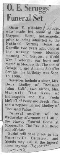 | Other | Age 86. Harvey-Cook funeral home (Rev. Donald Boyd officiating.) Parents: George R. and Amanda Shaffer Scruggs. Lived at Claypool Hotel until illness. Died at National Nursing Home, Danville. WW I veteran, US Army. |