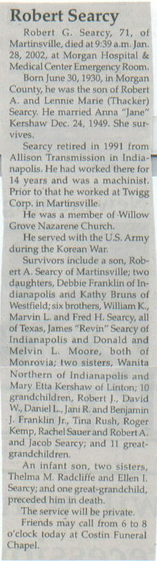 | Survived By | Widow; son, Robert A. Searcy; 2 daughters, Debbie Franklin and Kathy Bruns; 6 brothers, William K., Marvin L., Fred H., and James "Revin" Searcy, and Donald and Melvin L. Moore; 2 sisters, Wanita Northern and Mary Etta Kershaw; 10 grandchildren, Robert J., David W., Daniel L., Jani R. and Benjamin J. Franklin, Jr., and Tina Rush, Roger Kemp, Rachel Sauer, and Robert A. and Jacob Searcy; 11 great-grandchildren. |