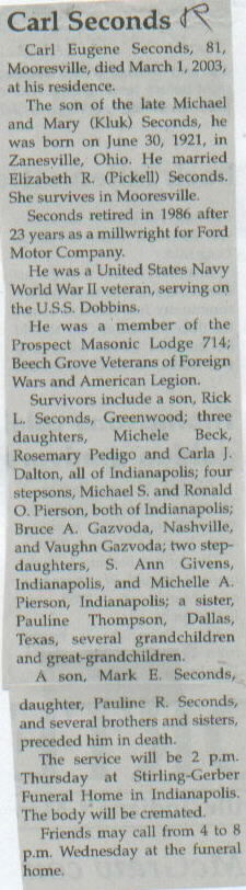 | Other | US Navy veteran, WW II, serving on the U.S.S. Dobbins. Son of the late Michael and Mary (Kluk) Seconds, he was born in Zanesville, Ohio. A son, Mark E. Seconds, daughter, Pauline R. Seconds, and several brothers and sisters, preceded him in death. The body will be cremated. |