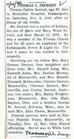| Other | Age 67. Harvey Funeral Home; Rev. Glen Rinard, Friends Church officiating. Buried White Lick cemetery. Parents: McKenzie (Mack) and Mary Wood Secrest. Died at Methodist hospital; born in Indiana. |