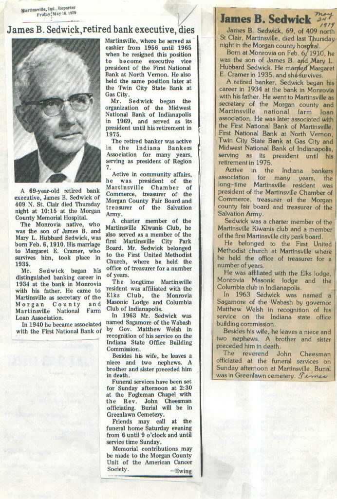 | Other | Age 69. Fogleman Chapel, Martinsville. Buried Greenlawn cemetery at Martinsville. Parents: James B. and Mary Hubbard Sedwick. Retired banker. Died in Morgan Co. hospital. |