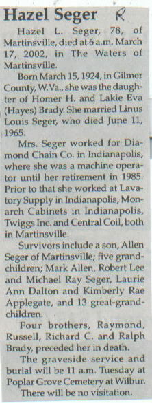 | Survived By | Son, Allen Seger; 5 grandchildren, Mark Allen, Robert Lee and Michael Ray Seger, Laurie Ann Dalton, and Kimberly Rae Applegate; 13 great-grandchildren. |