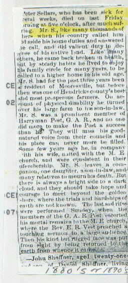 | Other | Age 56 years, 8 months, and 13 days. "From the Mooresville G.A.R. #278...condolences for Peter Sellers, an honored soldier." Quaker and Civil War soldier: Co. B, 97 Reg. Ind. Vol. Son of Jordan Sellars and wife. |