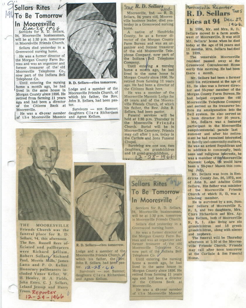 | Other | Age 94. Funeral at Friends Church; Carlisle Mortuary. Buried Mooresville Cemetery. Son of John R. and Adaline Sellars. |