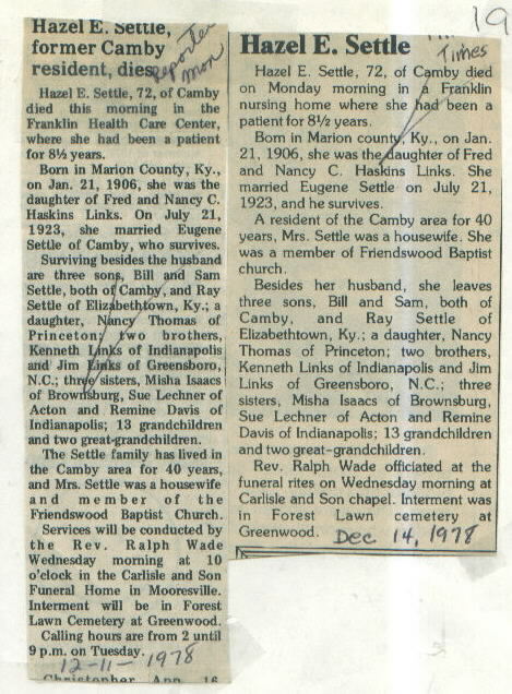 | Survived By | Husband; sons, Bill, Sam, and Ray Settles; daughter, Nancy Thomas; brothers, Kenneth and Jim Linds; sisters, Misha Isaacs, Sue Lechner, and Remine Davis. |