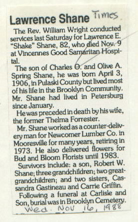 Other Age 82. Carlisle Chapel. Buried Brooklyn cemetery. Parents: Charles O. and Olive A. Spring Shane. Died at Vincennes hospital; born in Pulaski Co.