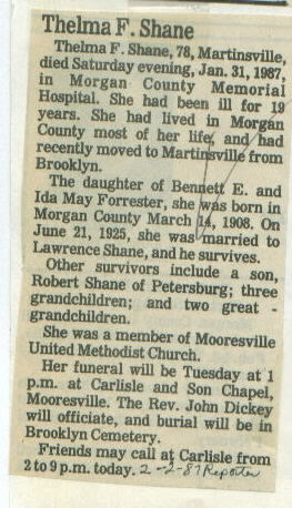 | Other | Age 78. Carlisle Chapel (Rev. John Dickey officiating.) Buried Brooklyn cemetery. Parents: Bennett and Ida Mae Forrester. Died in Morgan Co. hospital; born in Morgan Co. |