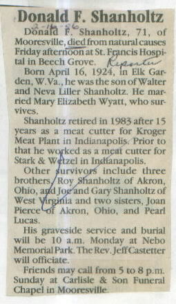 | Other | Age 71. Carlisle graveside services; burial Nebo Memorial Gardens, Martinsville. Parents: Walter and Neva Liller Shanholtz. |