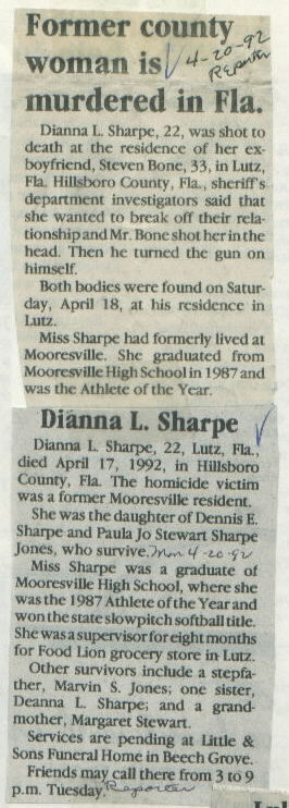 | Other | Age 22. Little & Sons Funeral Home, Beech Grove, Ind. Graduate Mooresville HS 1988. 1987 Athlete of the Year; won State Slow-Pitch softball title. Found April 18 at the residence of her ex-boyfriend, who shot her to death and then killed himself. |