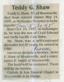 Survived By Brother, Steve E. Shaw of Mooresville; sister, Janice E. Smith, also of Mooresville.