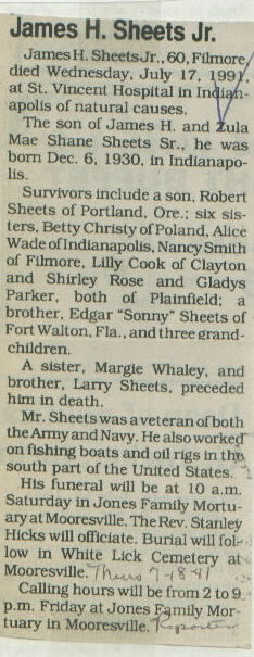 Other Age 60. Jones mortuary (Rev. Stanley Hicks.) Buried White Lick cemetery. Veteran of both US Army and Navy. Worked on fishing boats and oil rigs. Parents: James J. H. and Zula Mae Shane Sheets, Sr.