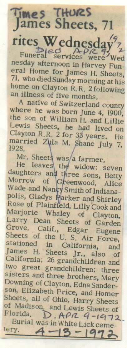 Other Age 71. Harvey Funeral Home; buried White Lick cemetery. Parents: William H. and Lillie Lewis Sheets. Farmer. Lived in Clayton 33 years.
