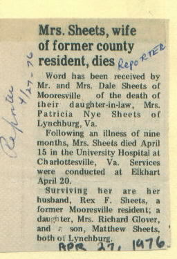 | Survived By | Husband; daughter, Mrs. Richard Glover, and son, Matthew, both of Lynchburg, Va. (Her in-laws were Mr. & Mrs. Dale Sheets of Mooresville.) |