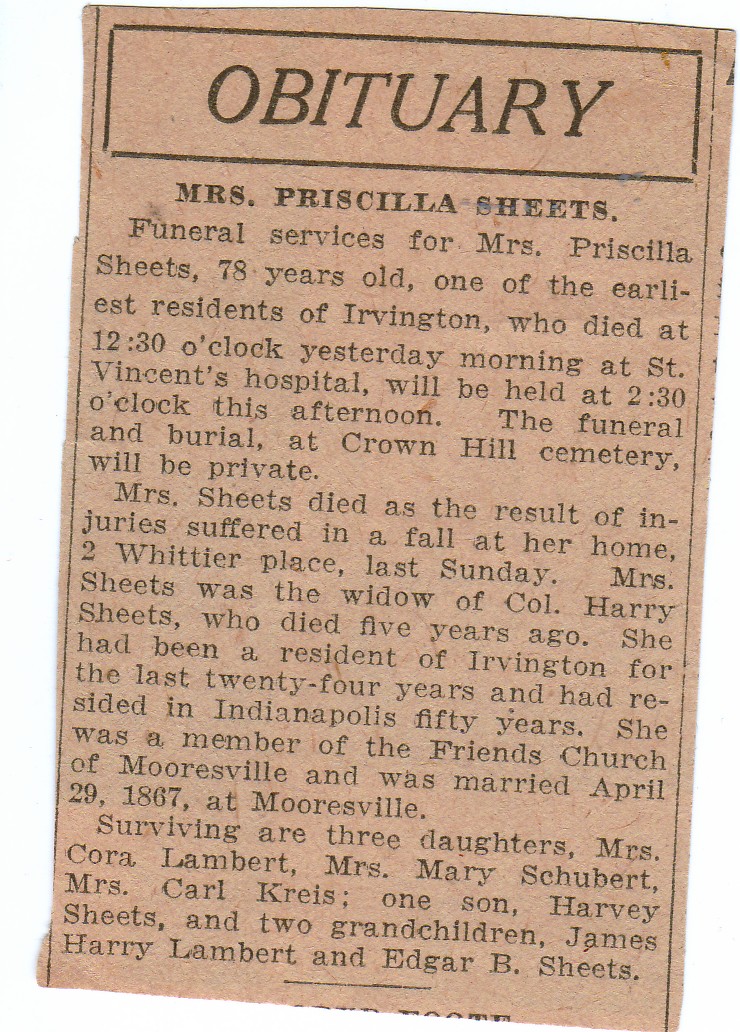 | Survived By | Three daughters, Cora Lambert, Mary Schubert, and Mrs. Carl Kreis; one son, Harvey Sheets; 2 grandchildren, James Harry Lambert and Edgar Sheets. |