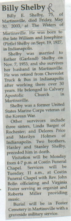 | Other | United States Marine Corps veteran of the Korean War. Born to the late William and Josephine (Pirtle) Shelby in Indianapolis. Two brothers, Hanley and Stanley Shelby, preceded him in death. |