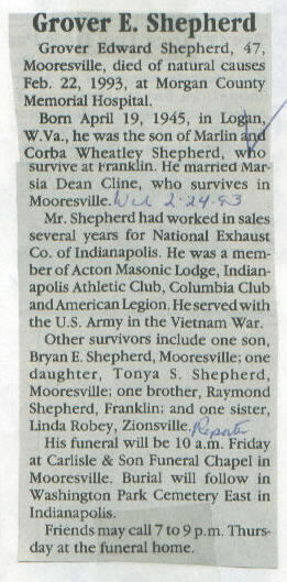 Other Age 47. Carlisle Chapel. Buried Washington Park East, Indianapolis. Parents: Marlin and C. Wheatley Shepherd. Died at Morgan Co. hospital; born in Logan, W. Virginia.