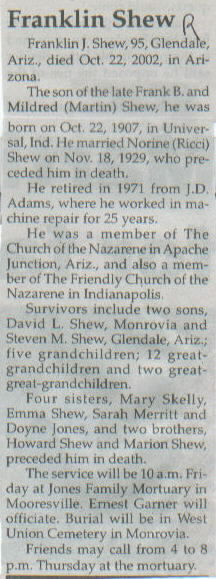 Survived By Two sons, David and Steven M. Shew; 5 grandchildren; 12 great-grandchildren; 2 great-great-grandchildren.