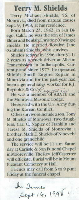 Survived By Widow; son, Tony M. Shields of Monrovia; daughters, Mrs. Carl Napier of Franklin and Teresa M. Shields of Monrovia; brother, Mark E. Shields of Nineveh; 1 grandchild.