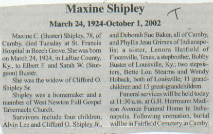 Survived By Four children, Alvin Lee and Clifford O. Shipley, Jr., Deborah Sue Baker, and Phyllis Jean Grimes; sister, Lenora Hatfield; stepbrother, Bobby Buster; 2 stepsisters, Bette Lou Stearns and Wendy Hoback; 11 grandchildren; 15 great-grandchildren.