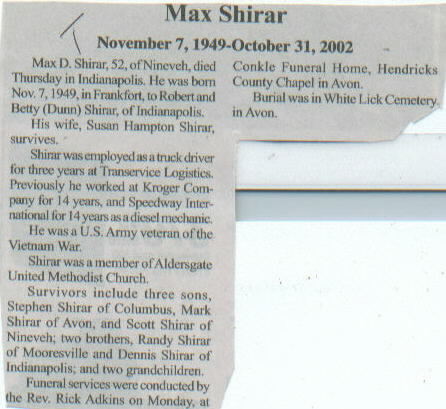 Survived By Widow; 3 sons, Stephen, Mark, and Scott Shirar; 2 brothers, Randy and Dennis Shirar; 2 grandchildren.