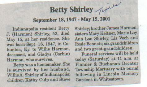 | Survived By | Spouse; mother, Gladys (Corbin) Harmon; children, Kathy Culp and Steve Shirley; brother, James Harmon; sisters, Mary Keltner, Marie Loy, Ann Lou Shirley, Liza Vech, and Rosie Bennett; 6 grandchildren; 2 great-grandchildren. |