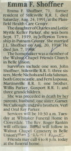| Other | Age 71. Whitaker Funeral Home, Cloverdale; burial Walnut Chapel Cemetery, Belle Union, Ind. |