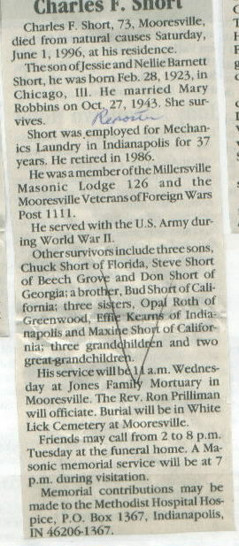 | Other | Age 73. Member Mooresville VFW. Jones Family Mortuary; buried White Lick Cemetery. |