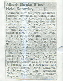 | Survived By | Brothers, Homer, Leslie, and Paul J. Shrake; sisters, Doris, Luwanna (Ellis), Mrs. Emmaline Gibbons, and Mrs. Phyllis Matney. |