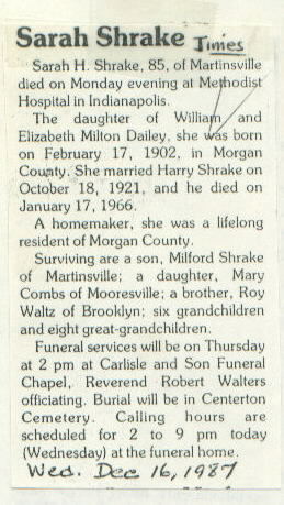 | Other | Age 85. Daughter of William and Elizabeth Milton Dailey. Her father died at the age of 41, and she and her 4 siblings were given to relatives by their mother. Sarah went to live with an uncle. Married Harry Shrake on Oct. 18, 1921. Mother of 3 children: William Maurice, Mary Elizabeth and Karl Milford. [Oldest son William Maurice was killed at the age of 20 on March 22, 1944 when his B-24 crashed in the jungle of New Guinea; his body was not found for 39 years, in April 1982. His remains were brought back to Centerton for burial.] Carlisle Funeral Chapel; buried Centerton Cemetery. |