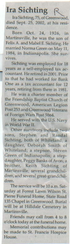 | Survived By | Widow; 2 sons, Stephen and Randal Sichting; daughter, Deborah Smith; stepson, Steven Green; stepdaughter, Peggy Banks; brother, Keith Sichting; several grandchildren and great-grandchildren. |