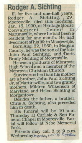 | Other | Age 29. Carlisle Chapel. Buried Nebo Memorial Park cemetery. Died Heritage House Convalescent Center, Martinsville after 5+ years illness. Parents: John Paul Sichting and Doris Brady Sichting. Graduate Monrovia HS. |