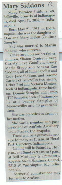 | Other | Age 48. Preceded in death by her mother, Mary Helen (Collins) Samples. |