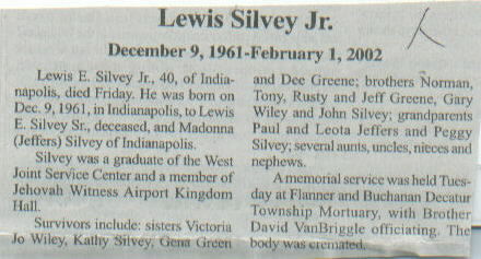 | Survived By | Mother, Madonna (Jeffers) Silvey; sisters, Victoria Jo Wiley, Kathy Silvey, Gena Green, and Dee Greene; brothers, Norman, Tony, Rusty, Jeff, Gary Wiley, and John Silvey; grandparents, Paul and Leota Jeffers, and Peggy Silvey; several aunts, uncles, nieces, and nephews. |