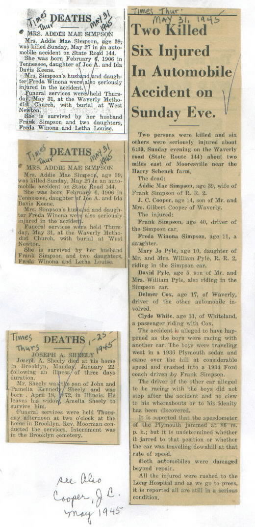 | Other | Age 39. Funeral at Waverly Methodist Church. Buried West Newton cemetery. Killed in an auto accident on State Road 144. Her two daughters were seriously injured in the accident; several other people were injured as well. J. C. Cooper, age 14, was also killed in the accident. |