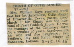 | Survived By | Wife; 5 daughters; 2 brothers, Ray and Ralph Singer of Sanborn, Ind. (Mrs. William Kays is sister-in-law.) |
