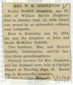 | Other | Age 66. She and her husband were both killed in an auto accident near Lafayette. Double funeral at Carlisle Chapel. Buried in family plot, Mooresville cemetery. Parents: John and Sarah McMillan Suddith. Born in Kentucky. |