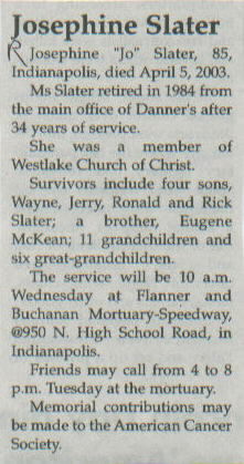 Survived By Four sons, Wayne, Jerry, Ronald, and Rick Slater; brother, Eugene McKean; 11 grandchildren; 6 great-grandchildren.