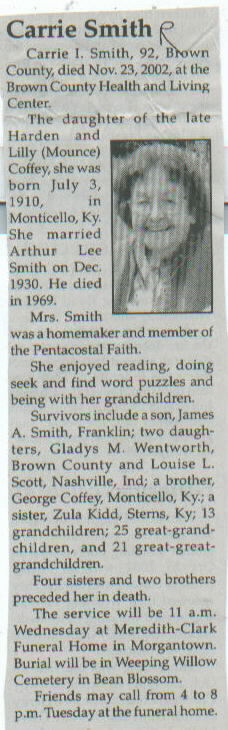Survived By Son, James A. Smith; 2 daughters, Gladys M. Wentworth and Louise L. Scott; brother, George Coffey; sister, Zula Kidd; 13 grandchildren; 25 great-grandchildren; 21 great-great-grandchildren.