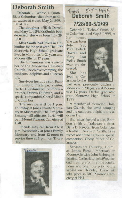 | Other | Age 38. Jones mortuary (Rev. John Sichting.) Buried Mt. Pleasant cemetery at Hall. Graduate Monrovia HS 1979. Parents: Jack Darrell and Mary Lou Fields Smith. Died at Columbus; born in McLeansboro, Illinois. |