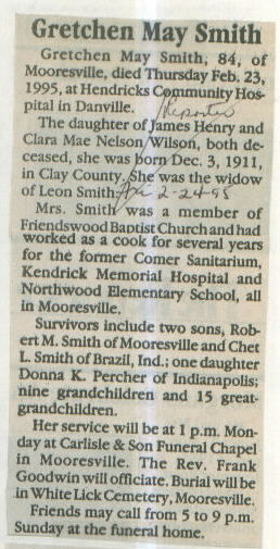 | Other | Age 84. Carlisle Chapel (Rev. Frank Goodwin.) Was a cook at Comer Sanitarium, Kendrick Hospital, and Northwood Elementary School. Parents: James Henry and Clara Mae Nelson Wilson. Died in Hendricks Co. Hospital. |