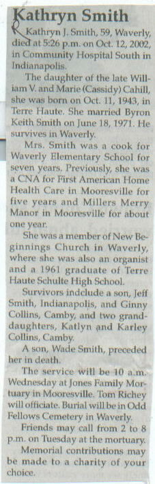 | Survived By | Spouse; children, Jeff Smith and Ginny Collins; 2 granddaughters, Katlyn and Karley Collins. |
